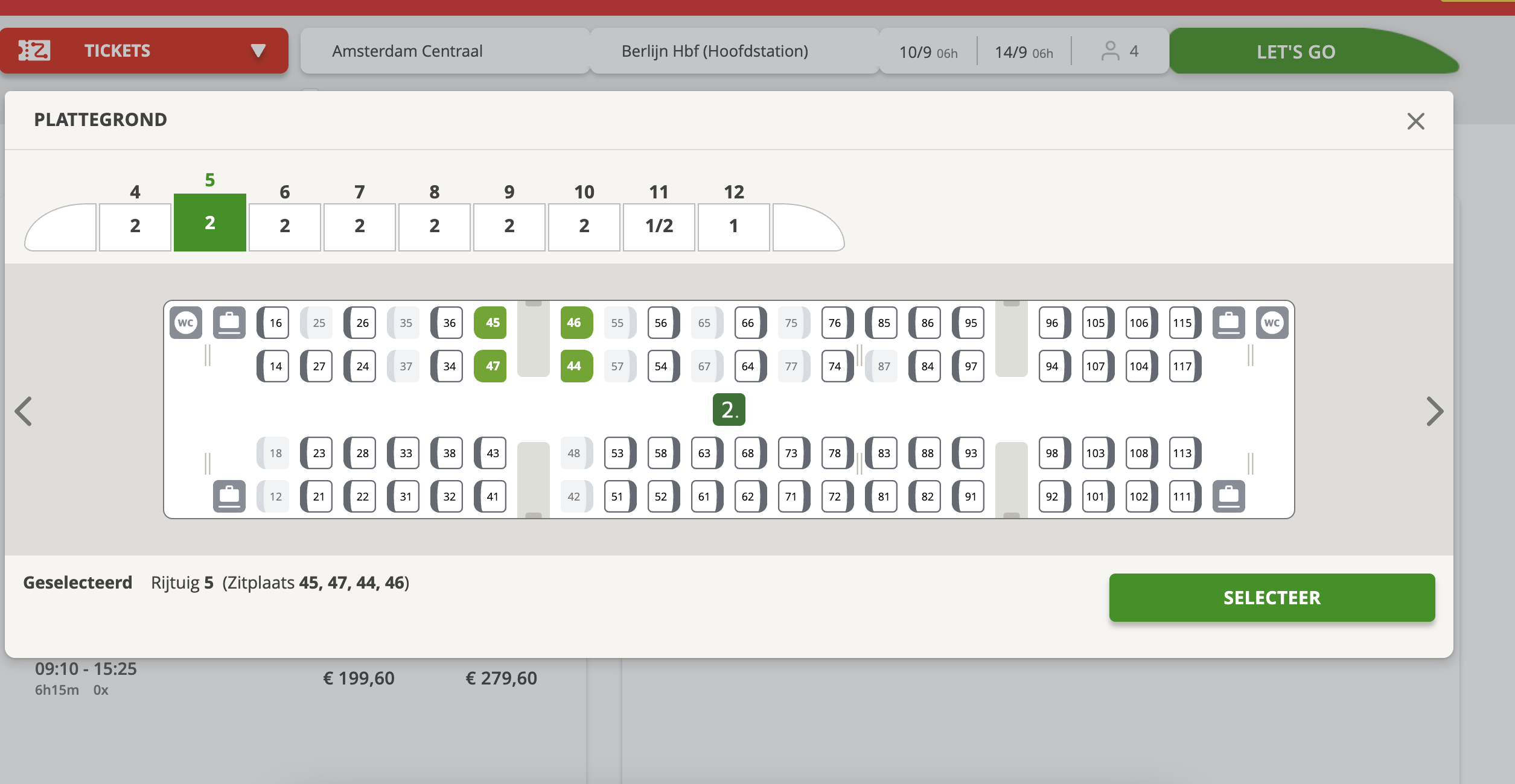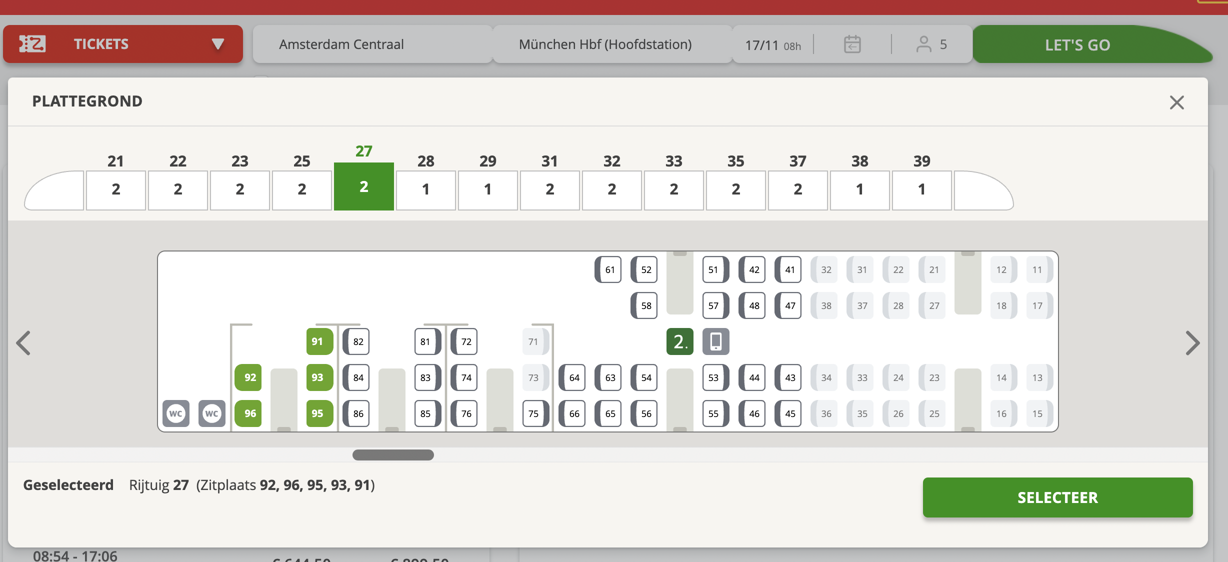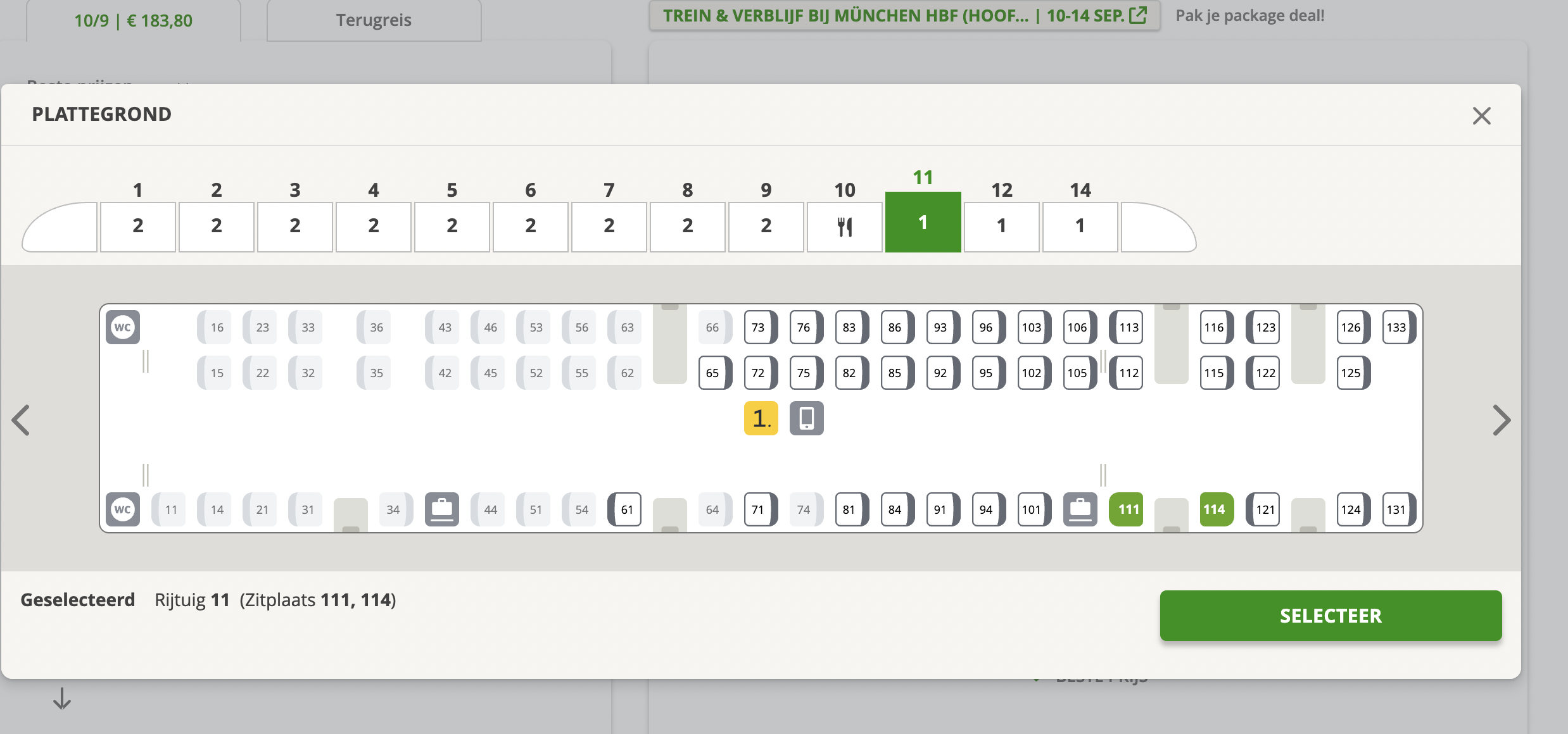 Kies per trein je stoel op de plattegrond, bijvoorbeeld plaatsen met een tafel, in het familierijtuig, een solo seat in 1e klas of je eigen compartiment.