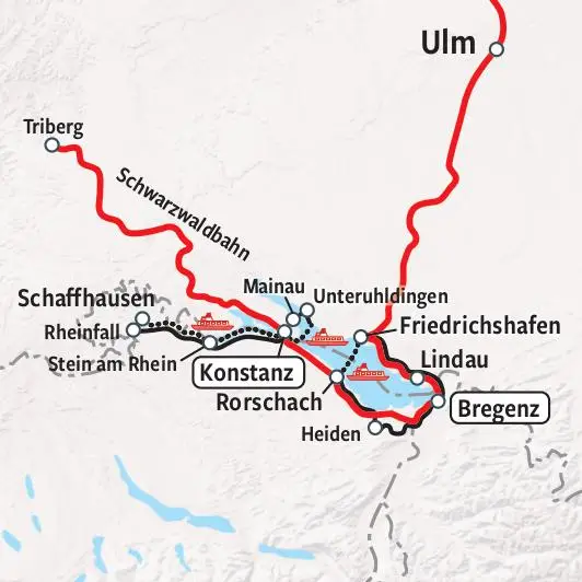 Sinds 2025 met directe ICE-verbinding naar Zuid Duitsland. Overnachtingen in Oostenrijk/Bregenz en Konstanz/Duitsland. Inbegrepen excursies o.a. met historische tandradbanen in Appenzeller Land (Zwitserse kant Bodensee), veerboten over de Bodensee. Bezoek de prachtige binnensteden van het eiland Lindau en Meersburg, de unieke prehistorische Pfahlbauten in Unteruhldingen, mediterraan bloemeneiland Mainau. Een van de mooiste musea in Zwitserland: het Henri-Dunant Museum. Prachtige wandelpromenade’s langs het meer. Mogelijkheid voor fietshuur. Rheinfall Schaffhausen. Terugreis via de Schwarzwaldbahn.