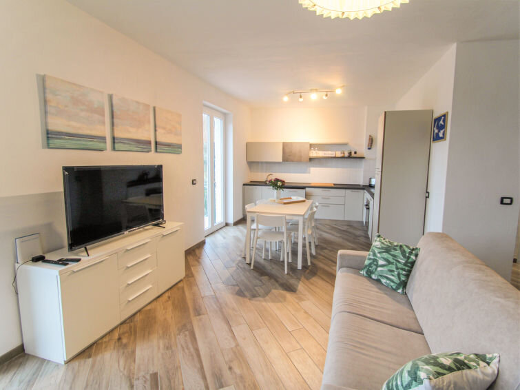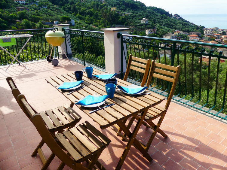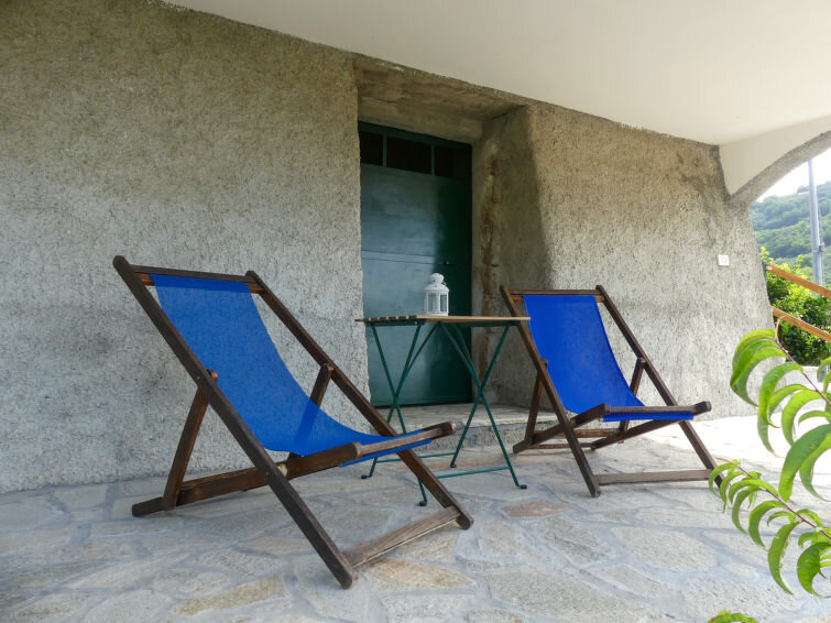 Huis 3-kamers 80 m2, op verhoogde begane grond. Licht, modern ingericht: groot woon-/slaapkamer met panoramavenster met 1 2-pers divanbed en TV. Uitgang naar het terras. 2 2-pers. kamers. Open keuken (4-pits kookplaat, oven, afwasmachine, broodrooster, waterkoker) met eettafel. Douche/bidet/WC. Gas-verwarming. Verwarming alleen beschikbaar van 15.10. tot 15.04. Groot terras, zithoek in de tuin overdekt. Terrasmeubelen. Mooi uitzicht op zee en het dal. Ter beschikking: wasmachine, klamboe, kinderbed. Internet (Internet (WiFi), gratis). 1 huisdier/hond toegestaan.