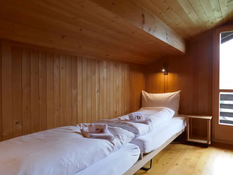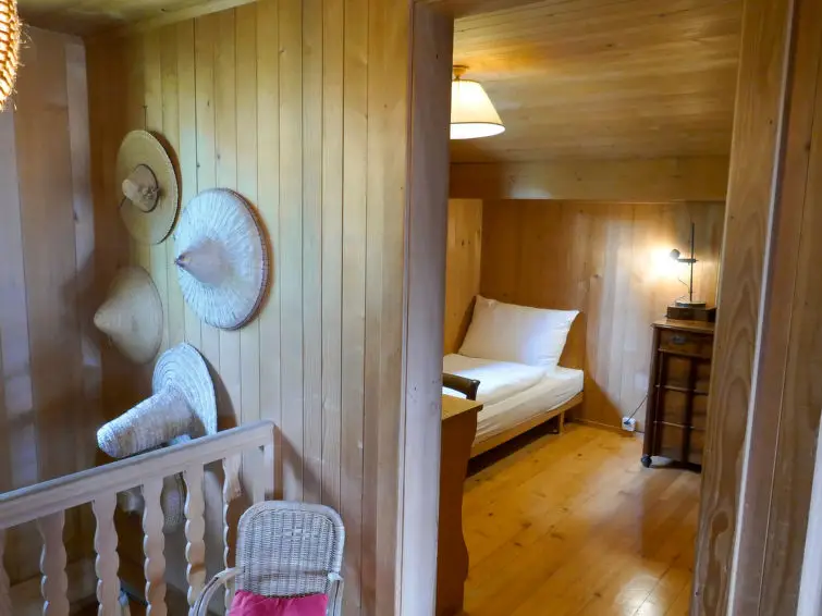 Bij binnenkomst bevindt u zich in de woonkamer, die is voorzien van een open haard en digitale televisie. Er is ook een aparte eetkamer. Vanuit de woonkamer heeft u toegang tot de tuin. Op deze verdieping is er ook een slaapkamer met twee eenpersoonsbedden en een eigen badkamer met een bad en toilet. Vanuit deze slaapkamer heeft u ook toegang tot het balkon. Verder is er een hal met een open haard (alleen decoratie) en nog een eethoek. De keuken is goed uitgerust met moderne voorzieningen, waaronder een oven, afwasmachine, keramische kookplaten, magnetron, elektrische koffiemachine, pads voor de koffiemachine (Nespresso) extra, raclette oven en fondue set. Er is ook een apart toilet op deze verdieping. Op de bovenverdieping bevinden zich vier slaapkamers. Eén kinderkamer met een eenpersoonsbed, één kamer met twee eenpersoonsbedden, één kamer met twee eenpersoonsbedden met toegang tot het balkon, en nog een kamer met twee eenpersoonsbedden en toegang tot het balkon. Er is ook een douche en toilet op deze verdieping.