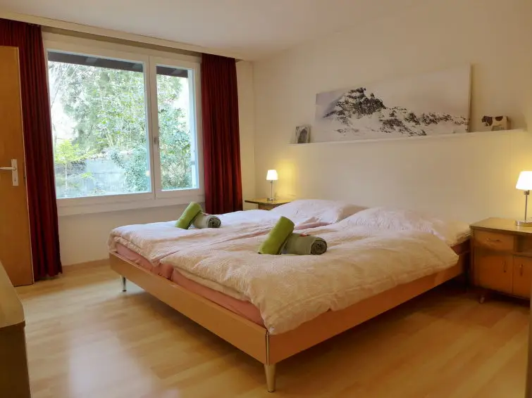Bij binnenkomst kom je in de ruime woon-/slaapkamer van 35 m2, die is voorzien van een uitschuifbaar bed (2 x 90 cm), kabel-tv, radio en een cd-speler. Vanuit deze ruimte heb je toegang tot het balkon en de zitplaats in de tuin, waar je kunt genieten van de rustige omgeving. Het appartement beschikt over een tweepersoonsslaapkamer met een tweepersoonsbed (2 x 90 cm breed, 200 cm lang). De open keuken is uitgerust met een 4-pits kookplaat, oven, magnetron, elektrische koffiemachine, Nespresso-apparaat, raclette oven en fondue set (kaas). Er is ook een eethoek en een zwedenkachel, die bijdraagt aan de rustieke sfeer van het appartement. De badkamer is voorzien van een bad en toilet. Het grote balkon van 15 m2 is op het zuidwesten gelegen en is voorzien van terrasmeubelen, waar je kunt ontspannen en genieten van het prachtige uitzicht op de omgeving. Extra voorzieningen in het appartement zijn onder andere gratis WiFi. Huisdieren (1 hond) zijn toegestaan.