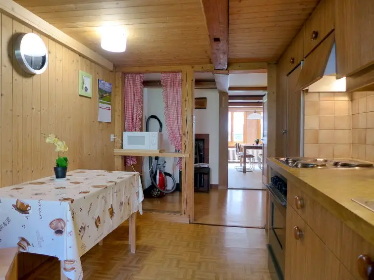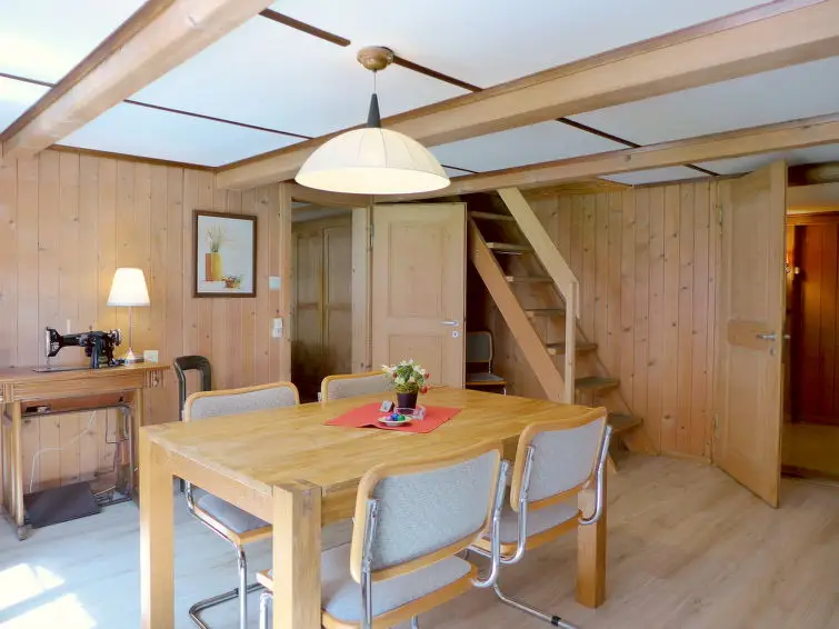 Bij binnenkomst kom je in de woon-/eetkamer met een divanbed, satelliettelevisie, een flatscreen-tv en een radio. De hoogte van het plafond varieert tussen 185 en 200 cm, waardoor een gezellige sfeer ontstaat. De woonkamer biedt toegang tot het balkon, waar je kunt genieten van het uitzicht op de omgeving. Het appartement beschikt over twee slaapkamers. Op de begane grond is er een tweepersoonskamer met twee bedden (90 cm breed, 200 cm lang) en toegang tot het balkon. De badkamer op deze verdieping is voorzien van een douche en toilet. Op de bovenverdieping, bereikbaar via een steile trap, bevindt zich een grote tweepersoonskamer met twee bedden (90 cm breed, 200 cm lang) en een klein balkon. De open keuken is uitgerust met een 3-pits kookplaat, oven, afwasmachine, broodrooster, waterkoker, magnetron, elektrische koffiemachine, raclette oven en fondue set (kaas). Er is ook een eettafel waar je gezellig kunt dineren.