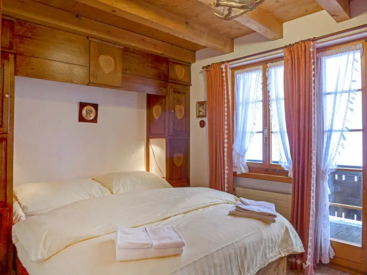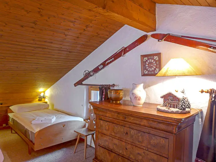 Op de bovenverdieping, bereikbaar via een steile trap, bevindt zich een galerij van 25 m² zonder kast, waar drie eenpersoonsbedden (90 cm x 190 cm) staan. Vanaf het grote balkon kunnen gasten genieten van een prachtig panoramisch uitzicht op de bergen en het dal.