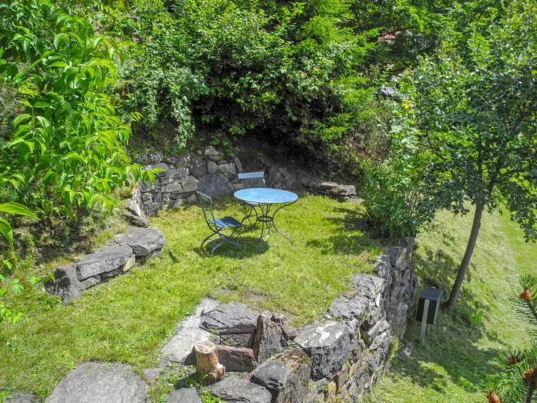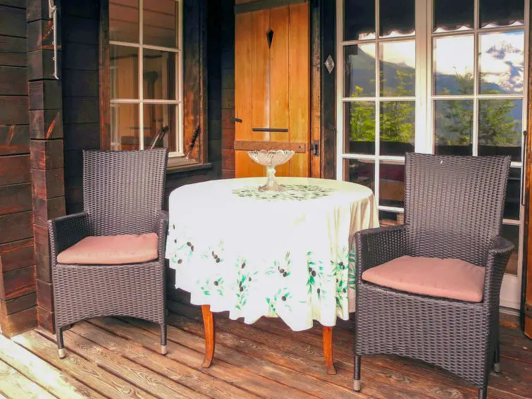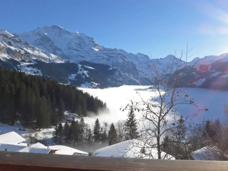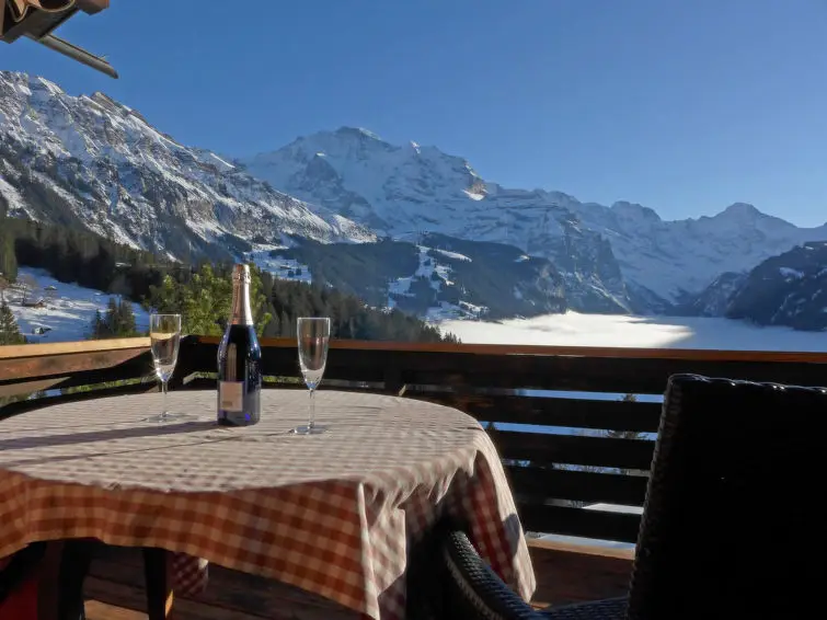 Vanuit de woonkamer is er toegang tot het balkon, waar gasten kunnen genieten van een prachtig panoramisch uitzicht op de bergen, het dal en de Jungfrau. Er is ook een zithoek in de tuin beschikbaar.