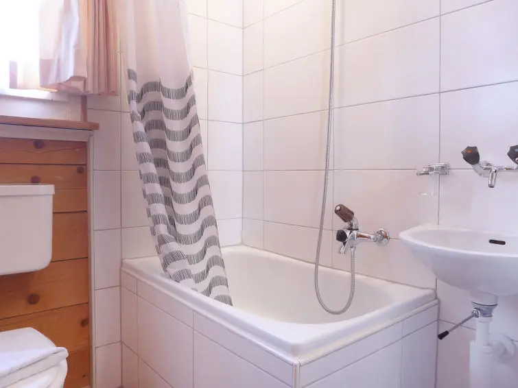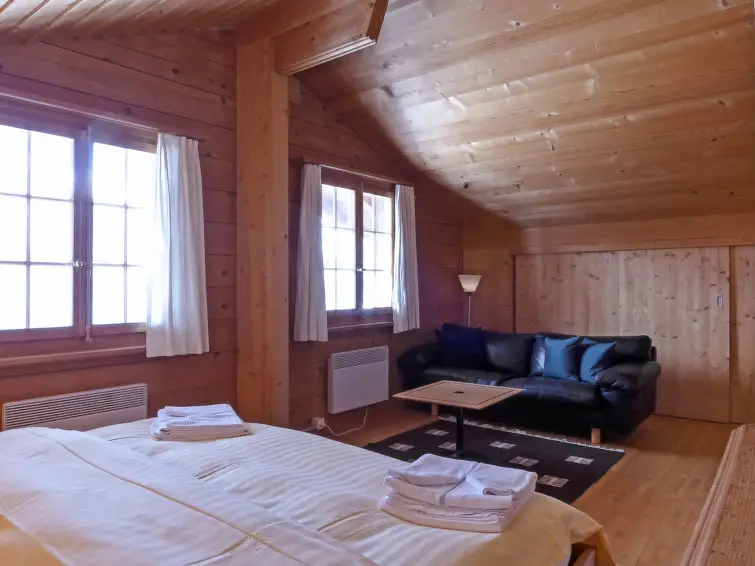 Op de bovenverdieping bevindt zich nog een slaapkamer met een tweepersoonsbed (180 cm x 200 cm) en een badkamer met bad/douche en toilet. Vanaf het grote balkon op deze verdieping kunnen gasten genieten van een prachtig panoramisch uitzicht op de bergen.