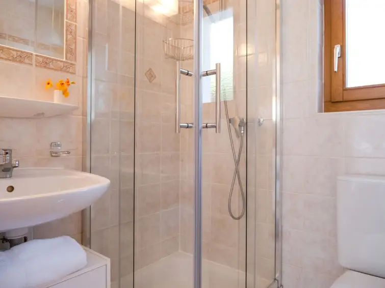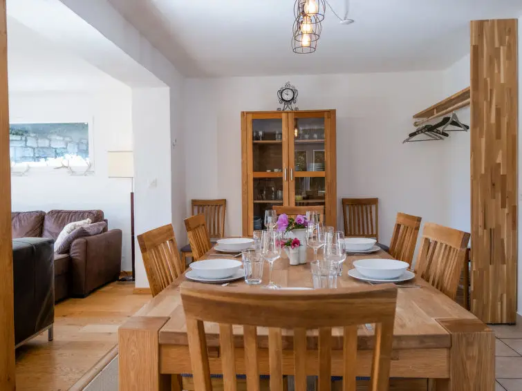 Op de begane grond bevindt zich een grote woon-/eetkamer met kabel-tv en elektrische verwarming, evenals een uitgang naar de tuin op het zuidoosten. De keukenhoek is goed uitgerust met een vaatwasser, 4 keramische glas kookplaten, broodrooster, waterkoker, magnetron, elektrische koffiemachine en een extra Nespresso-apparaat voor koffiepads. Er is ook een douche en een apart toilet op deze verdieping.